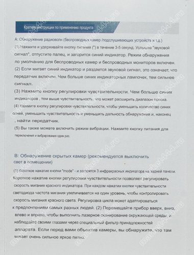 Режимы работы, поиска | 1) Электромагнитному излучению. 2) Магнитному полю. 3) Визуальный поиск скрытых микро видеокамер при ИК. 4) Фонарик. 5) Противоугонная сигнализация. |